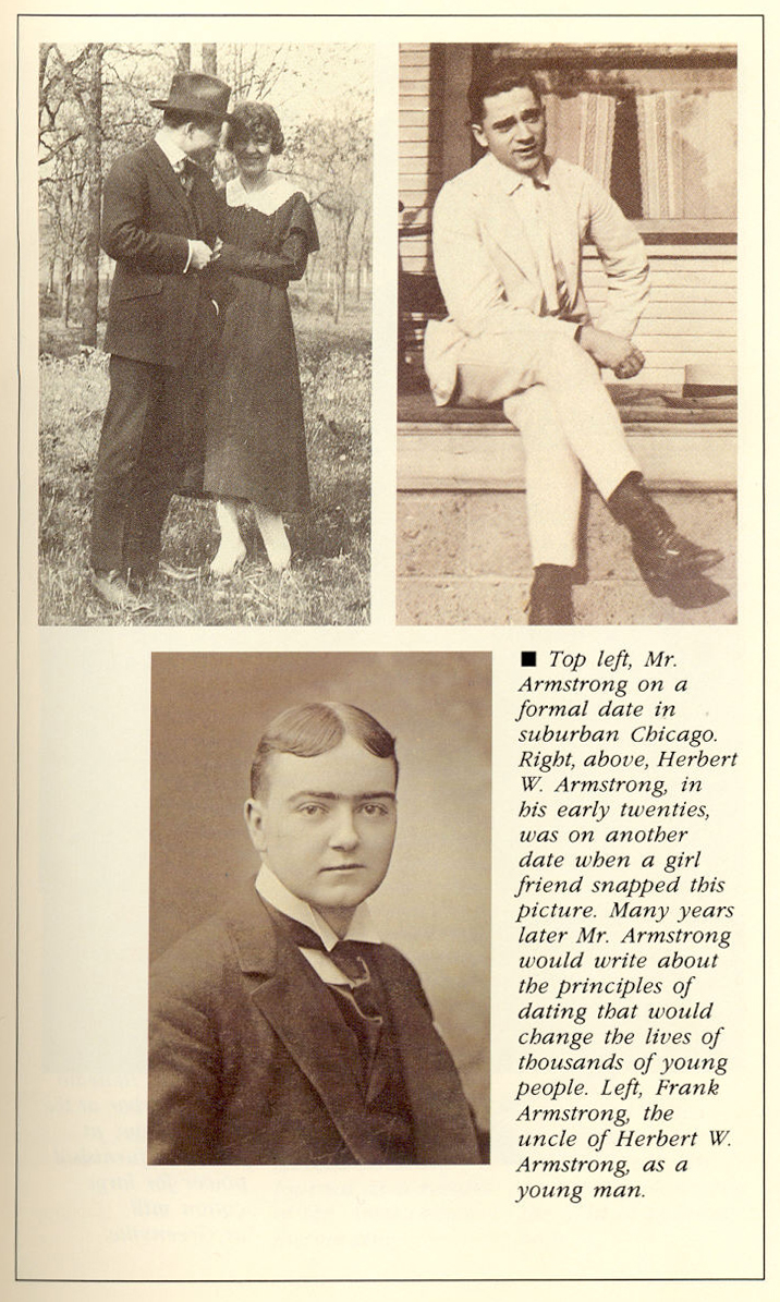 12.-Arriba a la izquierda, el Sr. Armstrong en una cita formal en los suburbios de Chicago, al lado Herbert por sobre los veinte años, fue en otra fecha, cuando una amiga tomó esta fotografía, muchos años después, el Sr. Armstrong escribiría sobre el principies de datting que cambiaría las vidas de miles de jóvenes. Izquierda Frank Armstrong, el tío de Herbert cuando era joven.