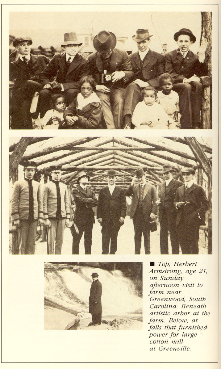 13.- Herbert Armstrong a la edad de 21 años, un Domingo por la tarde visitando una granja, cerca de Greenwood, Carolina del Sur . Abajo, acopio de algodón para las grandes fábricas en Greenville