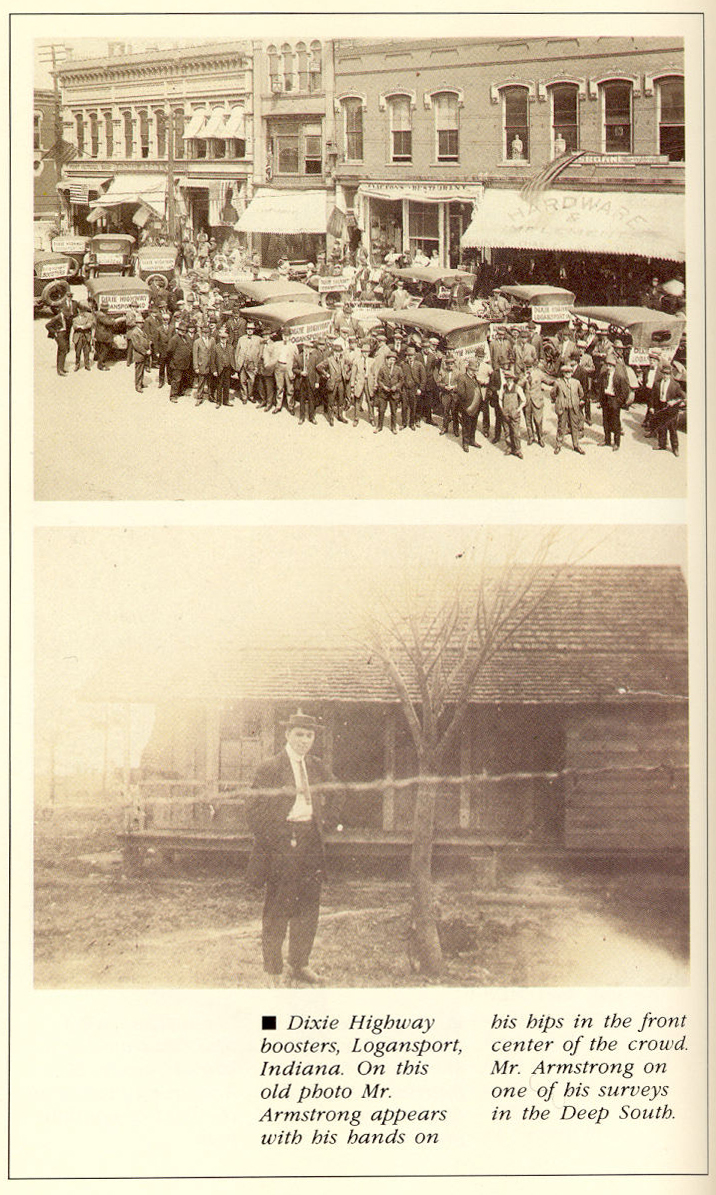 15.- Impulsores Dixie Highway, Logansport, Indiana. En esta vieja foto de Armstrong parece un poco con sus bandas en la cintura en el centro frente a la multitud. Abajo el Sr. Armstrong en uno de sus estudios profundos en el sur