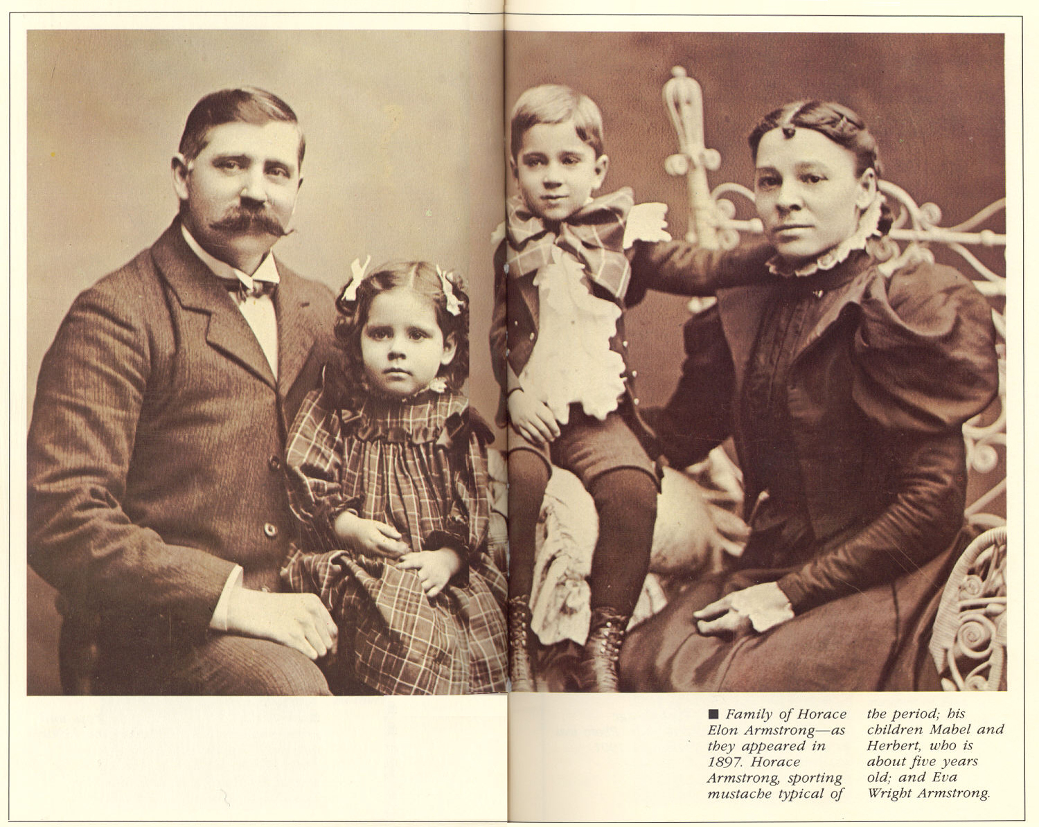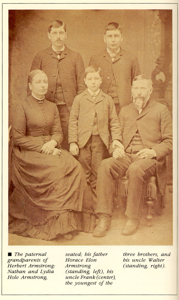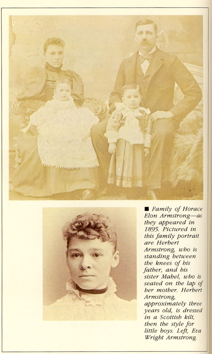 2.- Familia de Horacio Elon Armstrong- tal como aparecieron en 1895, representado en este retrato de familia de Herbert Armstrong, que está de pie entre las rodillas de su padre, y su hermana Mabel, que está sentada en el regazo de su madre. Herbert Armstrong aproximadamente de tres años, está vestido con un KILT SCOTTISB, en aquel entonces era el estilo para los niños pequeños, a la izquierda Eva Wrigth Armstrong.