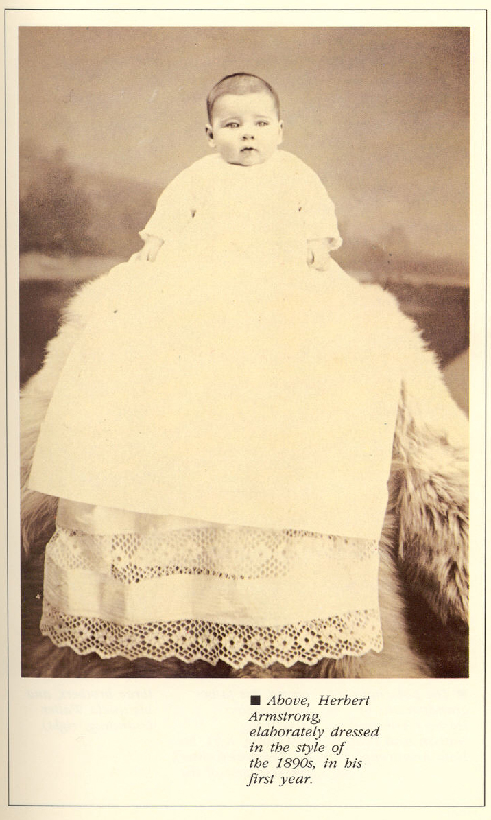 3.-Arriba, Herbert Armstrong, elaboradamente vestido a la usanza de los años 1890(s), en su primer año.