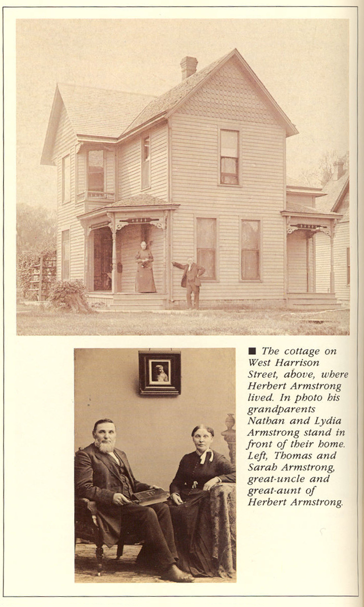 6.-La casa de campo en el oeste de la calle Harrison, donde Herbert Armstrong vivía. En la foto sus abuelos, Nathan y Lydia stand de Armstrong en frente de su casa, abajoThomas Armstrong Sarab tío grande y la tía abuela de Herbert Armstrong.