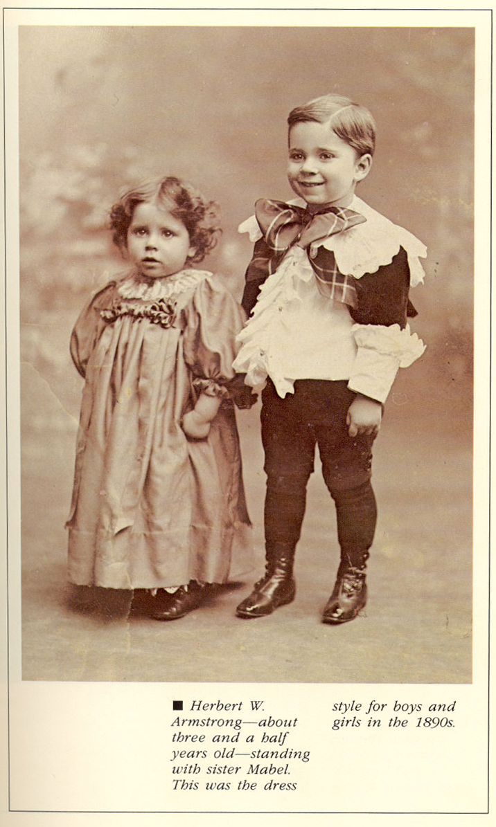 7.-Herbert Armstrong y de pie cerca de tres años y medio con Mabel su hermana. Este fue el estilo de vestir de niños y niñas en los años 1980(s)